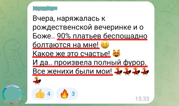 Моей подопечной эта методика позволила сбросить вес, влезть в платье, которое пылилось в шкафу уже много лет и собрать все комплименты на корпоративе.
