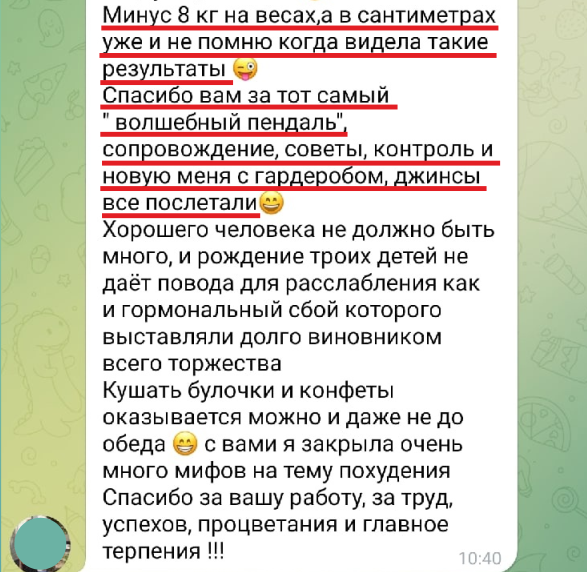 Кроме этого, у меня для тебя есть ещё кое-что интересное — закрытый телеграм-канал, в котором опытные тренеры-нутрициологи делятся секретами идеального похудения.
